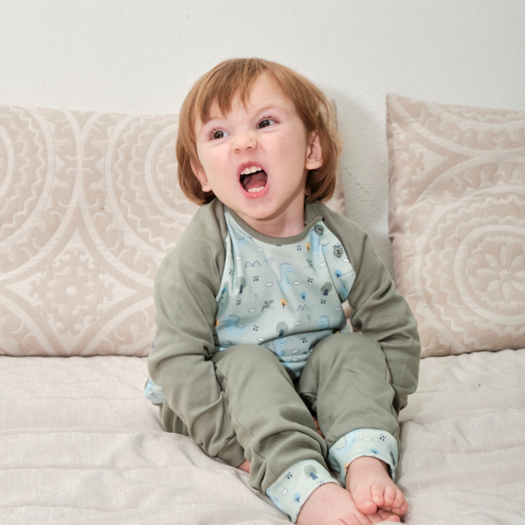 Pijama composto por duas peças. Manga comprida e decote redondo com botões no ombro. Calças compridas com cós elástico. Pijama cardado por dentro. Confecionado num tecido 100% algodão. Fabricado em Portugal.